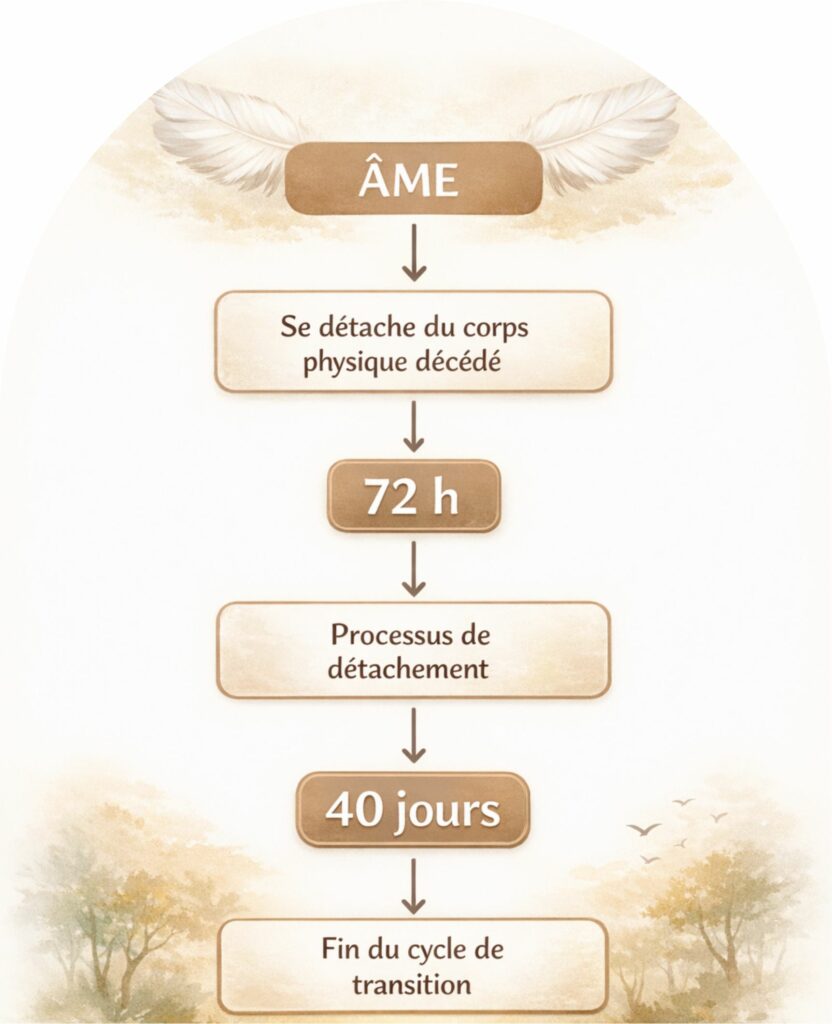 L’âme se détache à peu près en 72h00 pour quitter un corps physique, c’est pour cela que généralement il faut attendre 3 – 4 jours avant de l’enterrer; on retrouve cela dans toutes les traditions. Ensuite l’âme mets à peu près 40 jours pour arriver de l’autre côté.