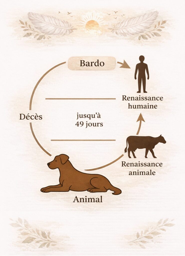 Les animaux n’ayant pas ce côté sombre des humains ne doivent pas, je pense, vivre cette étape de la même manière. Leur passage peut être plus “rapide” ou plus “flou” selon leur karma et leur état de conscience, car leur conscience est moins ancrée dans des concepts élaborés. Ce n’est bien évidement, que mon avis personnel en fonction de mes croyances sur ce sujet !