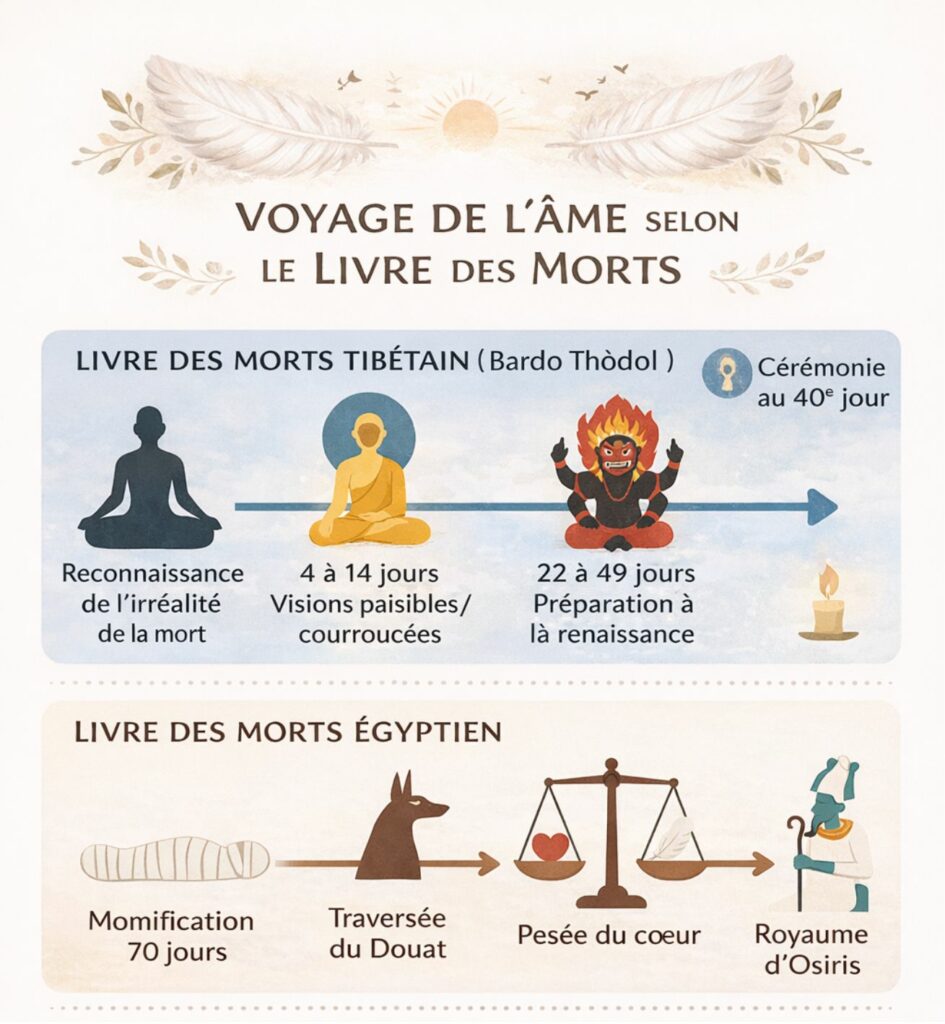 Et dans la tradition tibétaine, surtout dans le Bardo Thödol (souvent appelé le “Livre des Morts tibétain”), il est effectivement dit que la conscience du défunt traverse plusieurs états pendant 49 jours après la mort avant de se réincarner ou de se libérer du cycle des renaissances (Samsara).