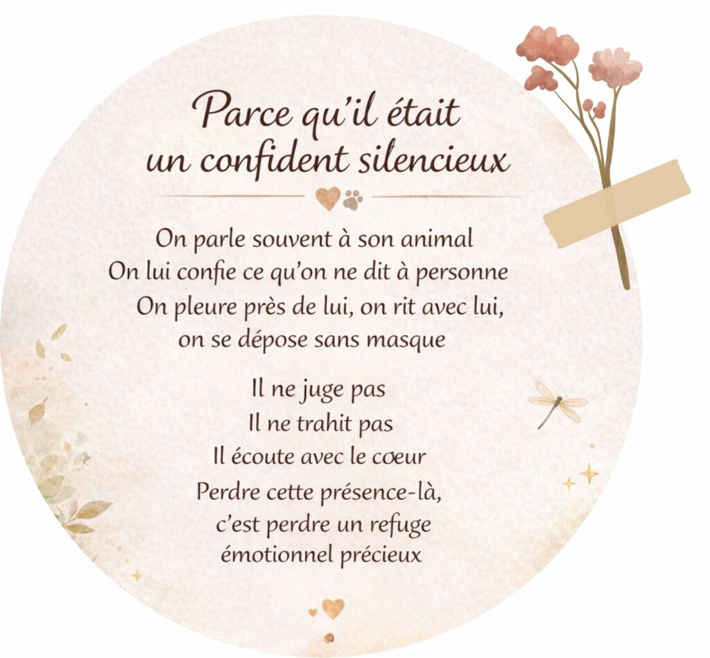 La perte d’un animal laisse souvent un vide immense et il est tout à fait normal de se sentir bouleversé, désemparé ou seul. Sachez que vous n’avez pas à traverser cette étape seul si vous en ressentez le besoin.